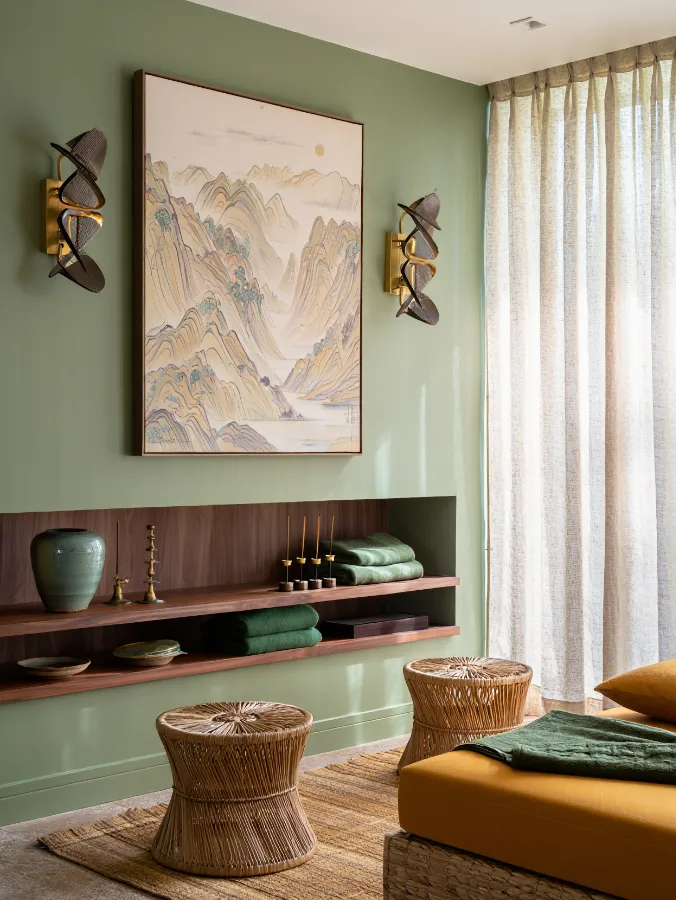 Un mur bleu nuit invite au recueillement (élément Eau), parfait pour un bureau de méditation. Un vert doux apaise dans le salon (élément Bois), tandis qu’un beige argile réchauffe la chambre (Terre). Il ne s’agit pas de décor à thème, mais de tonalité juste, ressentie, ancrée.